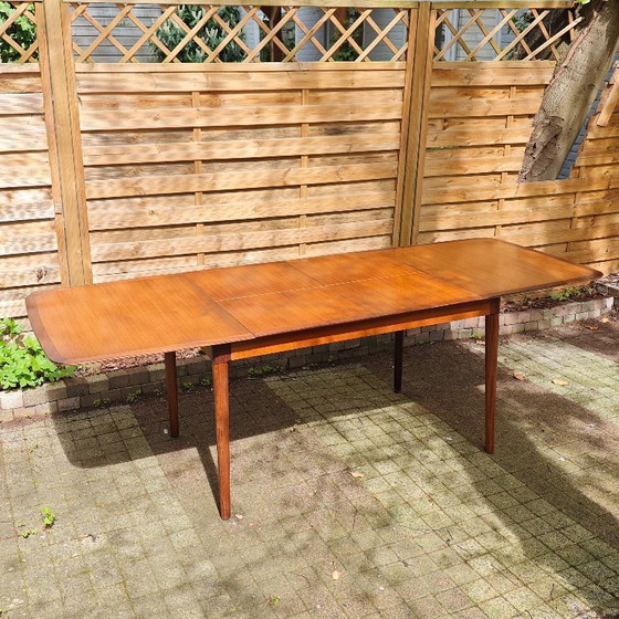 This beautiful table is still in very good vintage condition. There is one small spot on the tabletop, as you can see in the photos, but otherwise it is still completely intact. It is made of very beautiful teak wood. The leaves and legs can be easily removed, making it easy to transport and move. A very beautiful and practical dining table!