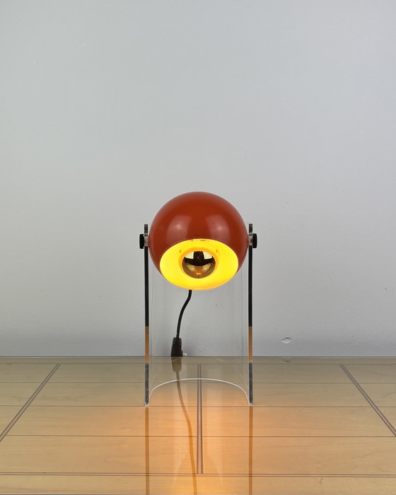 The transparent acrylic stand enhances the lamp’s floating effect, spotlighting the brown globe while maintaining an airy, unobtrusive presence. This piece seamlessly blends mid-century modern elegance with forward-looking futurist appeal, making it a standout decorative object for collectors and lovers of retro modern interiors.