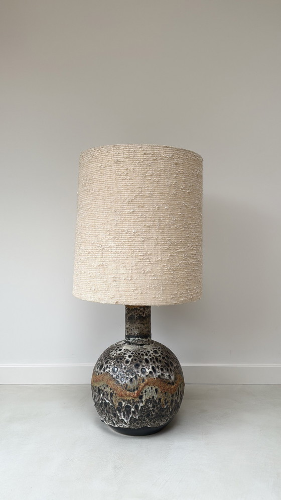 Vintage fat lava ceramic lamp with a beautiful beige shade. Dimensions: Base 28Ø / Shade 36/38Ø x 80H cm. The lamp is in good vintage condition, with minimal signs of use commensurate with its age. Can only be picked up in Maastricht, or delivery by arrangement.