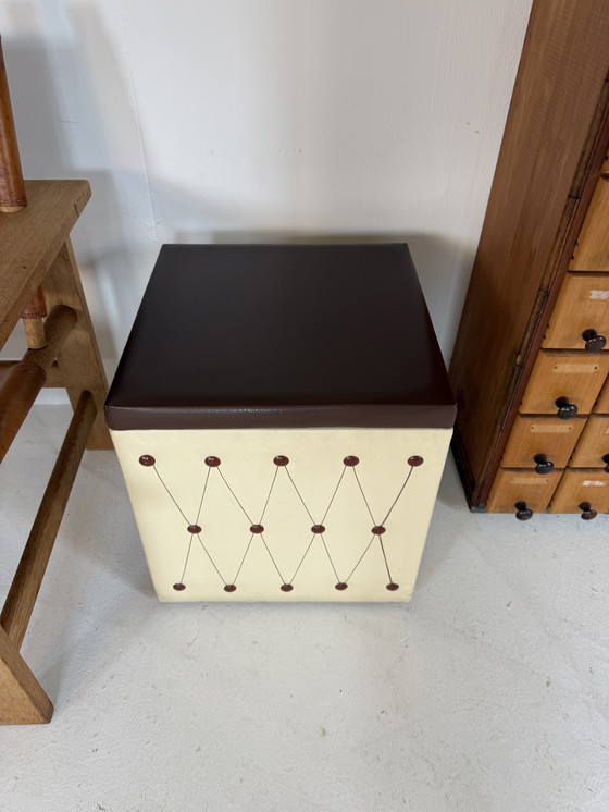 Beautiful eye-catcher. Vintage storage box/ottoman. Made of cream and brown faux leather with an elegant pattern on the front.