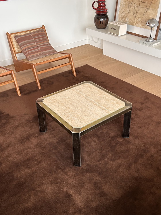 This vintage Fedam coffee table features a stunning travertine top, offering a timeless elegance to any living space. Its sturdy metal legs provide a sleek contrast, making it a versatile piece for both modern and classic interiors. Perfect for adding a touch of sophistication to your home.
