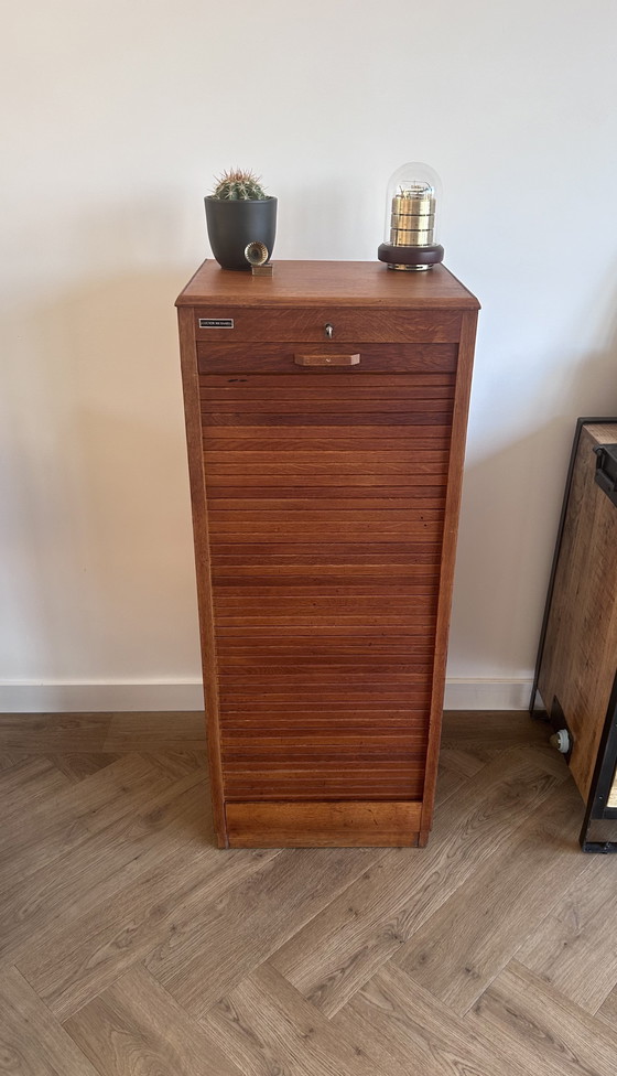 Beautiful Vintage rolling door/ filing cabinet. The wood a bit dried out and had a lot of damage. After a sanding and new coat of Wise Owl Salve, it can go another round! The furniture does have some color difference/damage in the veneer, see photos.