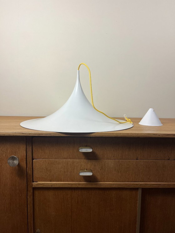 This is a classic Semi Pendant, also known as the "Witch Hat", designed by Torsten Thorup & Claus Bonderup for Fog & Mørup. Its elegant, conical design creates a warm, soft light, perfect above a dining table, kitchen block, or in the living room. A timeless example of Danish mid-century modern lighting.