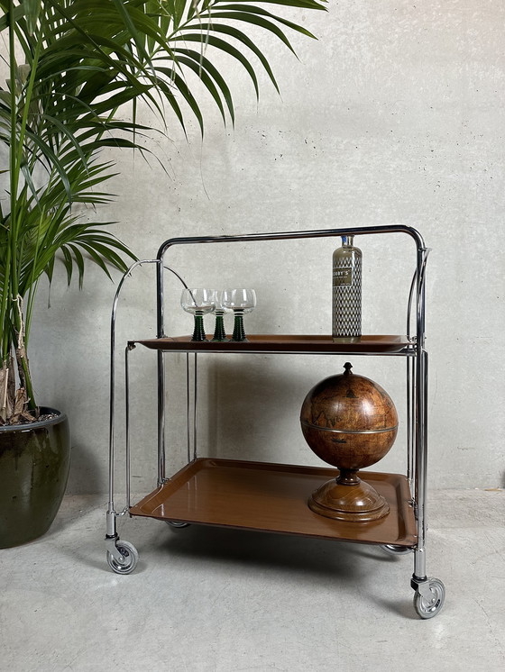 Handy vintage serving trolley made of metal (chrome) and plywood. It has a slightly industrial look. Marked: Gerlinol. When folded, it takes up only 10cm of space. It can be set up halfway, making it 24cm deep. Dimensions: 67 x 41.5cm. Height: 77cm. The wheels roll smoothly, the chrome is excellent, and the shelves show few signs of wear. Shipping by mail is possible upon request.