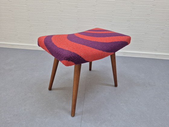 Footstool/stool/ottoman. Newly upholstered in a graphic print with the colors orange/red and purple. Legs show light age-related signs of use. In good vintage condition.