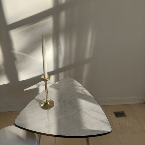 So cute this vintage side table! Very nice to combine with other pieces. Nice to use as a plant table. The triangular shape, tubular legs and blended formica leaf offer a nice addition to your interior.
