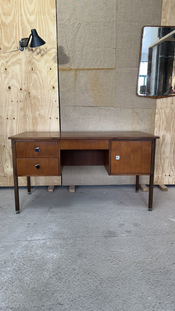 Vintage freestanding generous desk. The desk is for everyone, from all sides, a piece of furniture that could be seen. On one side 2 drawers, in the middle is also a drawer and on the right a door with a shelf. This desk is an an executive/director version because of the special double-sided finish. The other side of the desk has a large shelf what you can use to display items or as a bookshelf.