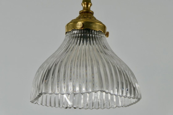 Elegant lamp made of holophane glass with relief to beautifully diffuse the light.