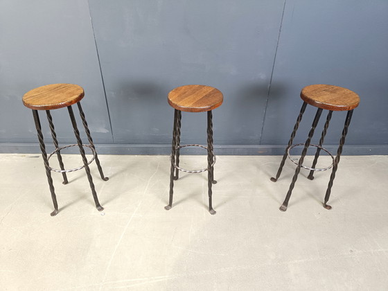 Vintage bar stools made from a round oak seat and a beautiful wrought iron twisted base with elegant feet.