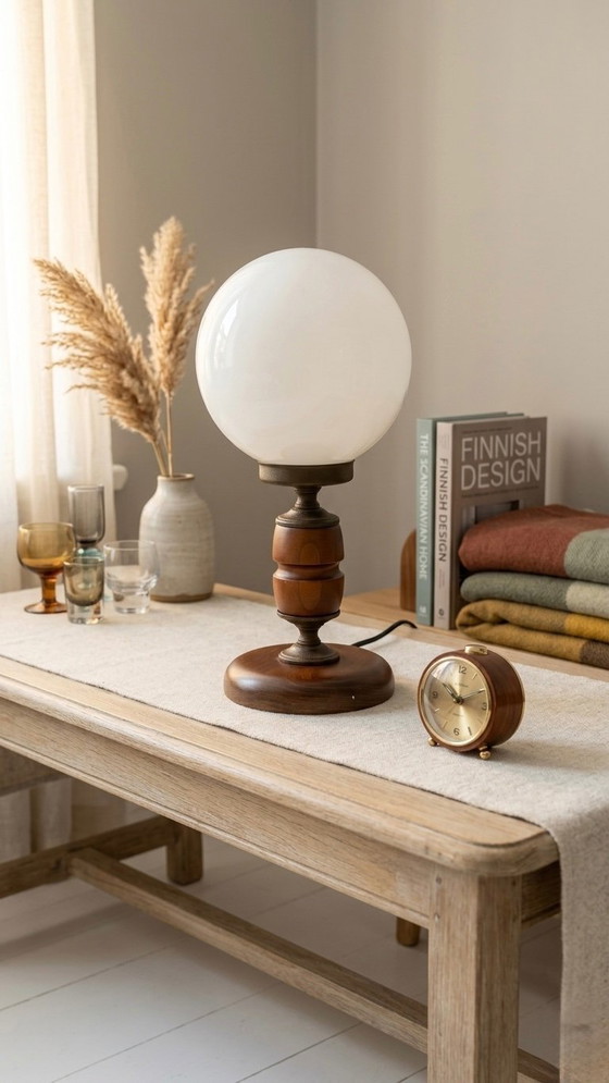 👉🏻 Opal glass shade and solid wood base and body, carved with a rich, natural finish that highlights the grain, providing a unique organic texture.
