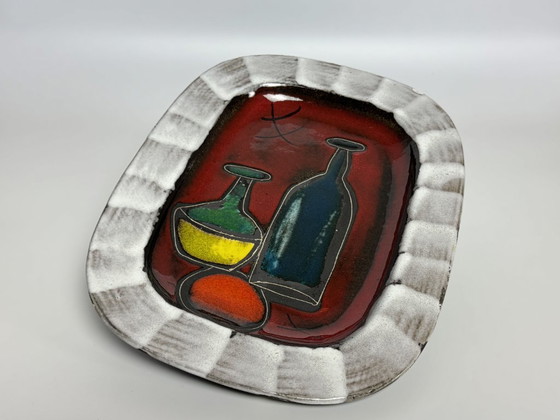 A beautiful vintage German rectangular enamel tray with rounded corners and a white border. Features a charming figurative design of a blue toned bottle, a green-and-yellow carafe and an orange circle on a deep red richly colored background. Minor chip on the edge. A highly decorative mid-century piece. Dimensions: H 3,5 W 33 D 26 cm.