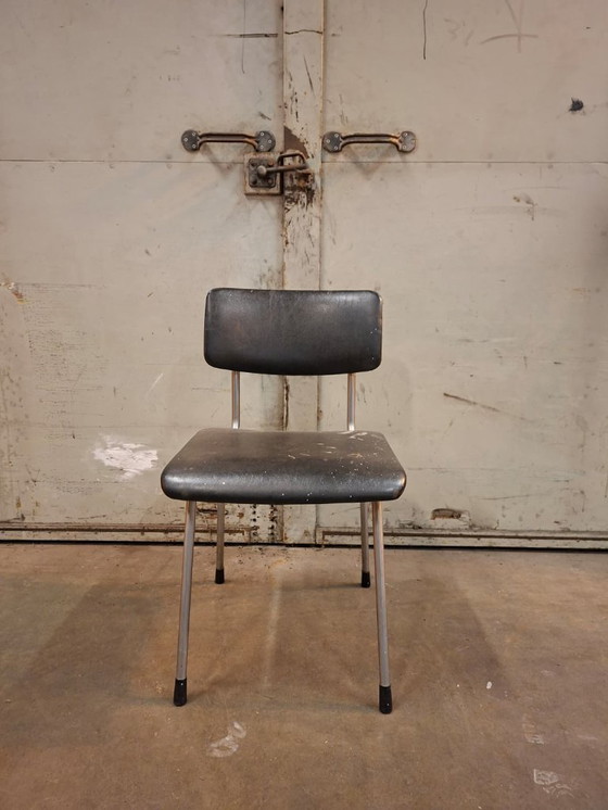 Original Gispen tubular chair model 1231 from the 1960s. The chair has a chrome tubular frame, black skai upholstery and the typical high "socks" around the legs. There is a handle on the back of the frame, making the chair easy to move.