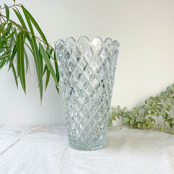 Add a touch of elegance and design to your home with this superb vintage molded glass vase, adorned with geometric motifs by Glasswork, Novy Bor manufactured during the 1960s. Its timeless design makes it ideal for showcasing your bouquets of dried or fresh flowers.
