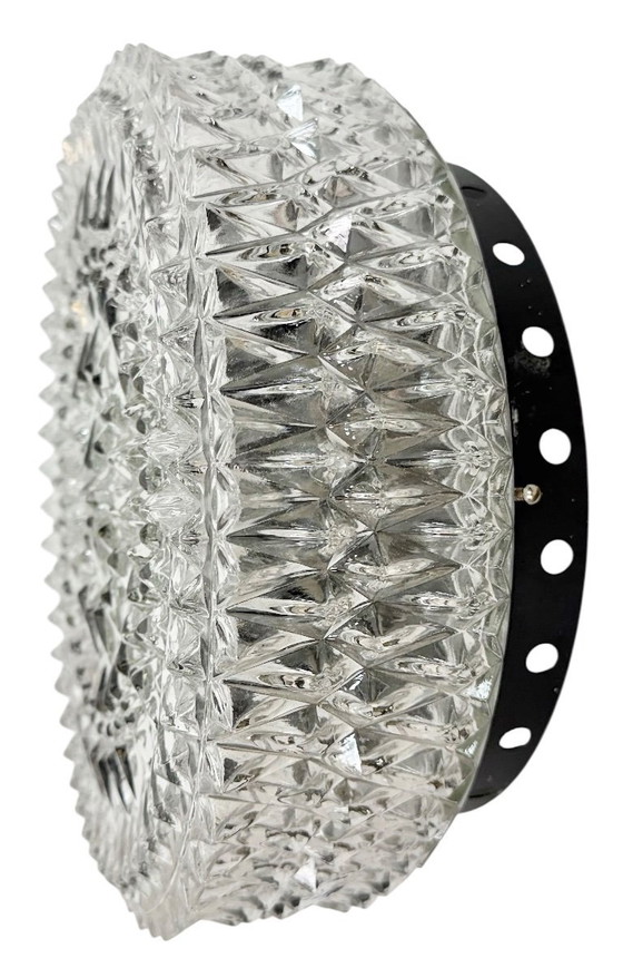 Vintage Industrial wall or ceiling lamp made by Elektroinstala in former Czechoslovakia during the 1970s. Was used in factory offices and corridors. It features a metal back and an embossed glass cover. Two bakelite sockets require two E14 lightbulbs. The diameter of the light is 25 cm. The weight of the light is 2 kg.