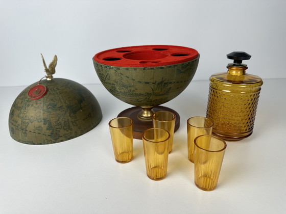 Vintage globe mini-bar with 5 plastic cups and a small glass liqueur bottle. Globe in beautiful condition. Looks great in a bar cabinet. Height 27cm. Diameter: 17cm. Weight: 1kg.