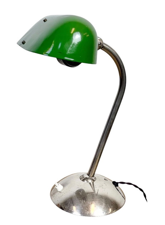 This green table lamp was made in former Czechoslovakia during the 1950s. It features a green enamel shade with a white enamel interior and a chrome plated iron base and arm with two adjustable joints. Bakelite socket requires standard E 27/ E 26 ligh bulbs. New wire.
