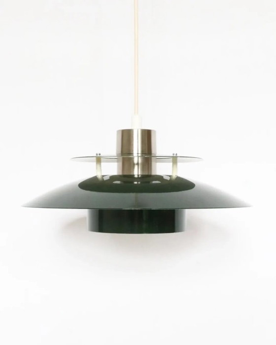 Beautiful Danish shell lamp in dark green color by manufacturer EL-Light (type 4107). With original pull pendant that allows the lamp to be adjusted in height. The cord can possibly be replaced for a new one. There are some irregularities in the beautiful deep green paint. The lamp is small in size and therefore nice for a cozy corner or above the dining table.
