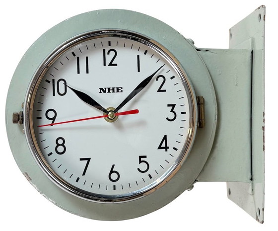 Vintage NHE ( NIPPON HAKUYO electronics,ltd. ) ships slave clock designed during the 1980s in Japan. These clocks were used on large Japanese tankers and cargo ships. It features a light green metal body, a metal dials and a convex clear glass covers with chrome frames. This item has been converted into a battery-powered clockworks and work on just 2 x AA battery. Dimensions: Clockface diameter: 15 cm, Width : 24 cm, Height: 20 cm, Depth: 14 cm.