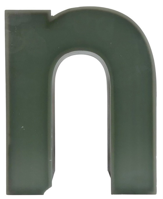 This vintage industrial illuminated letter “ n “ was made in Germany during the 1970s and comes from an old advertising banner. It features a black metal body and a grey plastic cover. It is equipped with a LED strip. The letter can be used as a table lamp or wall lamp.The weight of the letter is 0,5 kg.