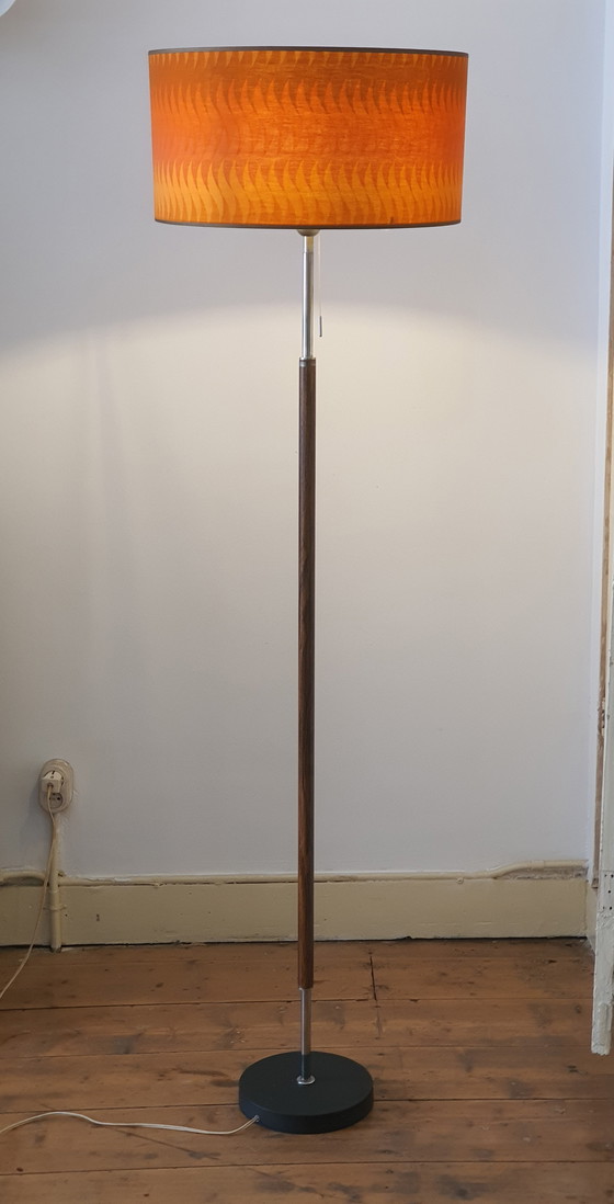 This vintage Herda floor lamp is a wonderful addition to any interior. The lamp has a striking orange shade with a unique pattern, combined with a slim wooden and metal stand. Shade in nice condition. With pull switch.