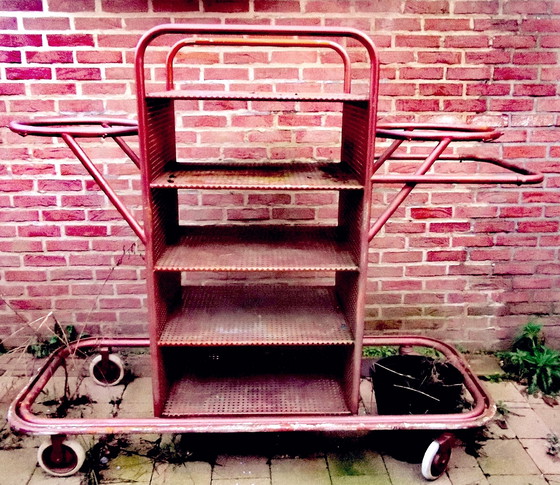 With its robust, handmade metal construction, this cart tells a story of craftsmanship and character. Ideal for both indoors and outdoors, as a unique decorative piece, plant rack, or storage unit. The sturdy wheels make it easy to move, while the multiple shelves offer ample storage. Add a touch of industrial flair to your home or studio with this unique find!