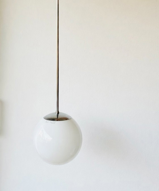 Beautiful original vintage pendant lamp from Czechoslovakia, produced by Krásno nad Bečvou in the 1960s. The lamp is a beautiful example of mid-century modern design: a timeless opal glass globe combined with a sleek metal suspension.