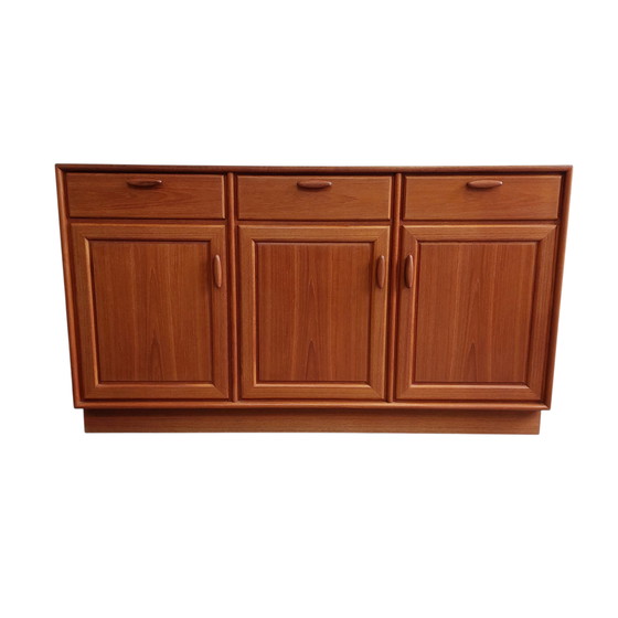 Beautiful vintage Heinrich Riestenpatt (RT Möbel) sideboard. Danish design made of teak and teak veneer. The dimensions are 149 x 45 x 84.5 cm (w x d x h). The sideboard has 3 drawers, 3 doors, and height-adjustable shelves. It is in neat vintage condition with some (minor) signs of wear. See also the photos, which are part of the description.