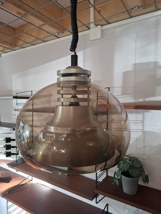 This beautiful vintage Herda ceiling lamp is a real eye-catcher for any interior. With its elegant acrylic glass shade and robust metal details, this lamp adds a touch of retro charm to your space. The warm brown shade of the glass provides atmospheric lighting that is perfect for both modern and classic interiors. - Unique vintage style with a timeless look - High-quality materials such as acrylic and metal - Ideal for creating a cozy and stylish ambiance - Add this special Herda ceiling lamp to your interior and enjoy the perfect combination of style and functionality.