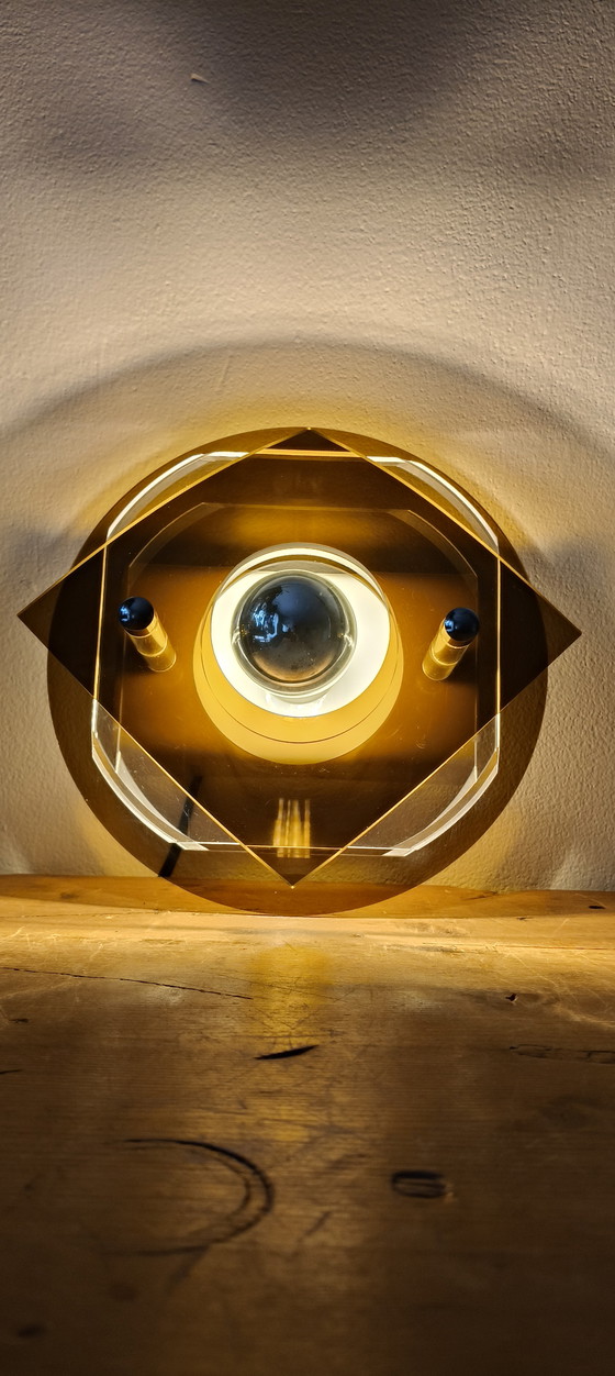 The lamp is crafted from a stylish combination of brown-tinted and clear Perspex (or acrylic) and creates a beautiful, warm play of shadows on the wall when lit.