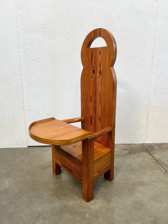A uniquely designed, brutalist-style pine high chair made in the 1970s. The designer and manufacturer are unknown, but it is very solidly made. The chair has a striking high backrest with an openwork, rounded top. The chair stands on four legs connected by arches. The top is removable. In good condition with signs of wear consistent with its age.