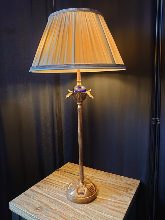 Vintage Hollywood Regency table lamp with a cobalt blue glass globe. Height: 65 cm. Technically sound. Only a small chipped plastic piece near the edge of one of the sockets. Not visible with the lampshade and bulb screwed in.
