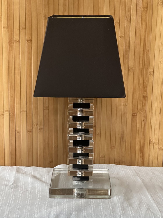 The glass base is composed of block-shaped segments, creating a beautiful interplay of light and reflection. Beautiful details in the glass, such as the cord channel!