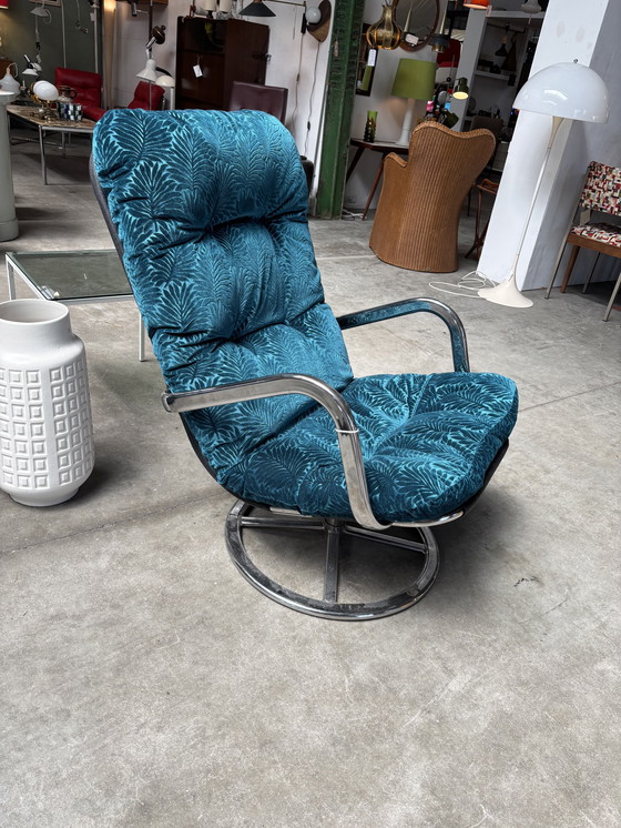 This vintage IKEA swivel chair features a striking blue textile with a leaf pattern, complemented by a sturdy metal frame. Its design offers both comfort and style, making it a perfect addition to any retro-inspired space. The chair's swivel function adds practicality, allowing for easy movement and versatility in placement.