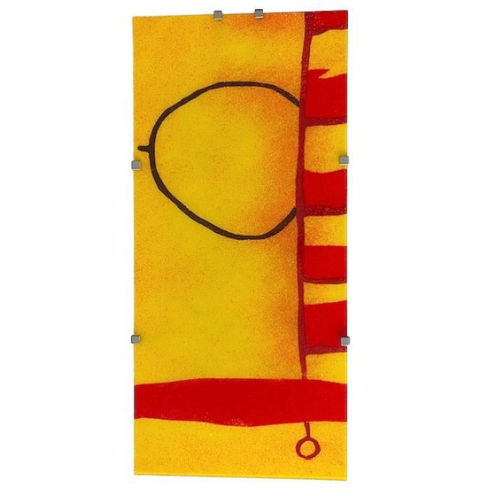 Vintage Ikea Gyllen Gotö wall lamp with a yellow and red glass panel and abstract art from the 1990s. This series is no longer produced. The wall lamp has two sockets. It is made of metal with a glass panel. The lamp can be hung horizontally or vertically. Beautiful warm colors. It can be hung either vertically or vertically. In good vintage condition. 26cm x 56cm x 9.5cm.