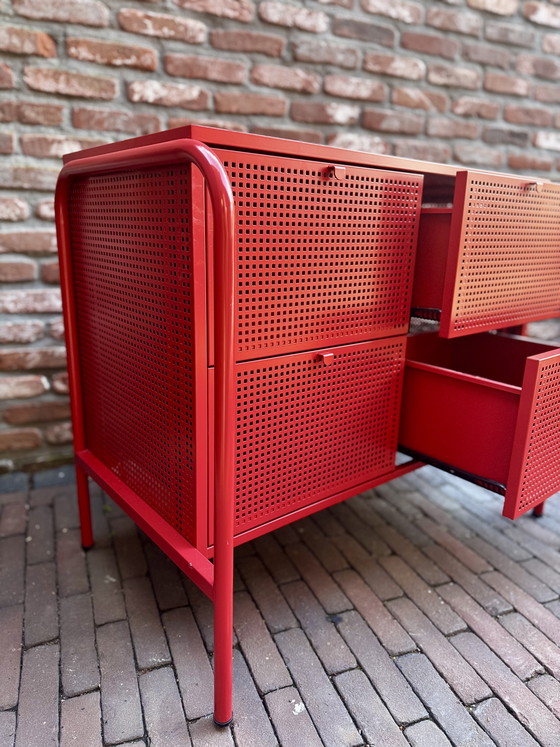 Sleek, industrial metal cabinet in a powerful red color. A true eye-catcher that is both functional and aesthetically strong, designed by Charlie Styrbjörn.