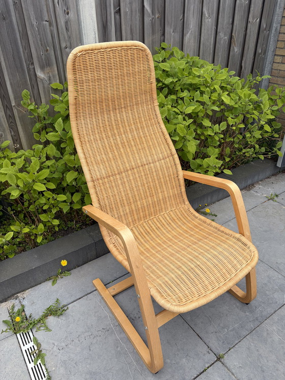 Experience the timeless charm of the Vintage IKEA Oland Yngve Ekstrom armchair. This beautiful piece, designed by the iconic Yngve Ekstrom, combines Scandinavian simplicity with a refined aesthetic that enriches any space. The elegant design and natural materials make this armchair a focal point in any interior.