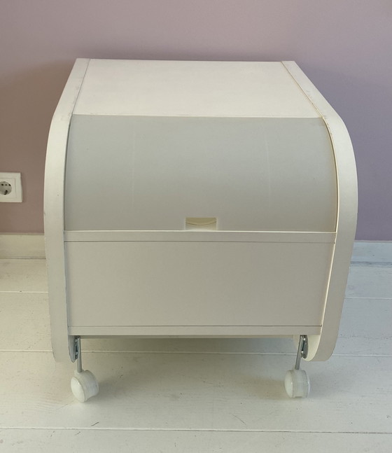 This is a vintage IKEA side table from the Ilen series, featuring a unique design with a curved structure and casters for easy mobility. The table is mainly white and made of durable plastic, making it both lightweight and sturdy. It offers practical storage space with its open shelves, perfect for organizing books or decorative items. A great addition to any vintage or minimalist interior.