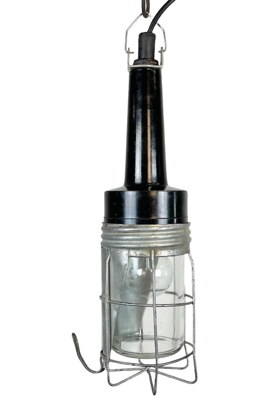 Industrial walkabout work lamp made in former Czechoslovakia during the 1960s These lamps were used in factories, workshops and army as a portable light source . It features a bakelite handle, an iron grid and clear glass cover.