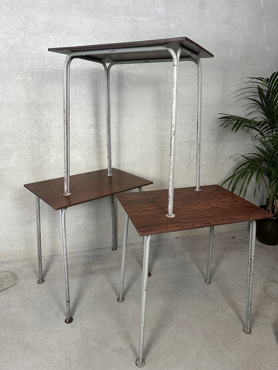 Rock solid vintage school tables with steel base and composite top. These tables can take a beating and are also weatherproof. Composite cannot rot. Ideal plant tables, tête-à-tête tables in a bistro or use them for what they were designed for, i.e. as lecterns. The tops have some plausible scratches, the base here and there paint loss. Slim but sturdy tables. Price is per piece. Height: 75cm. Width: 68,5cm. Depth: 48,5cm. Weight: 12kg. Matching chairs also available in our other ads. In stock: 3