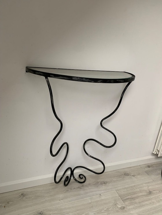 This vintage iron and glass console table is a real eye-catcher for your interior. With its unique, wavy iron frame and elegant glass top, this table adds a touch of artistic flair to any room. Perfect for an entryway or as a decorative accent in the living room.