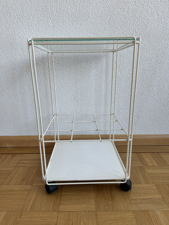 Vintage Isocele drinks trolley/bar cart from the 1970s. The frame is made of white metal with glass shelves. The trolley is in good condition; the glass is undamaged. The white frame has some signs of wear (see photos). Dimensions: 31 cm deep, 31 cm wide, and 50 cm high.