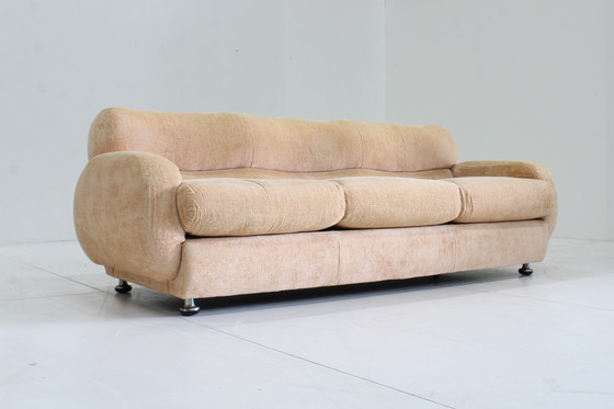 Vintage Italian 3 seater sofa from the 70s in a beautiful beige fabric with chrome legs. This awesome vintage sofa is also great to sit on. Vintage sofa in good condition with standard user marks appropriate to the time.