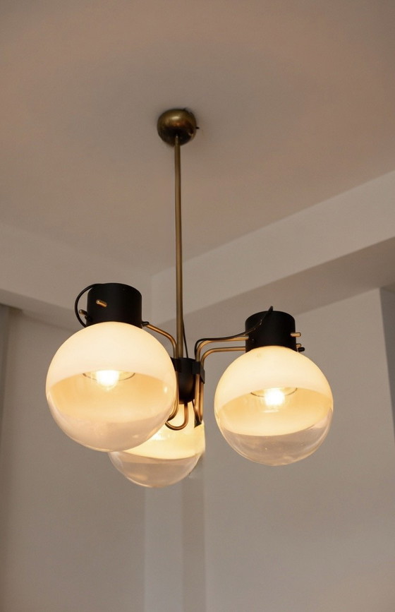 Italian-made pendant lamp, 1960s-1970s. Three two-tone blown glass spheres: a white opaline upper cap and a transparent lower cap. Brass frame (with a natural period patina), matte black enameled metal bulb holders.