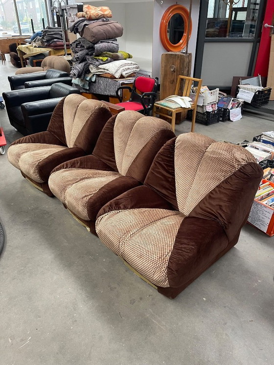 Set of 3 sculptural lounge chairs in velvet upholstery, 1970's Italy.