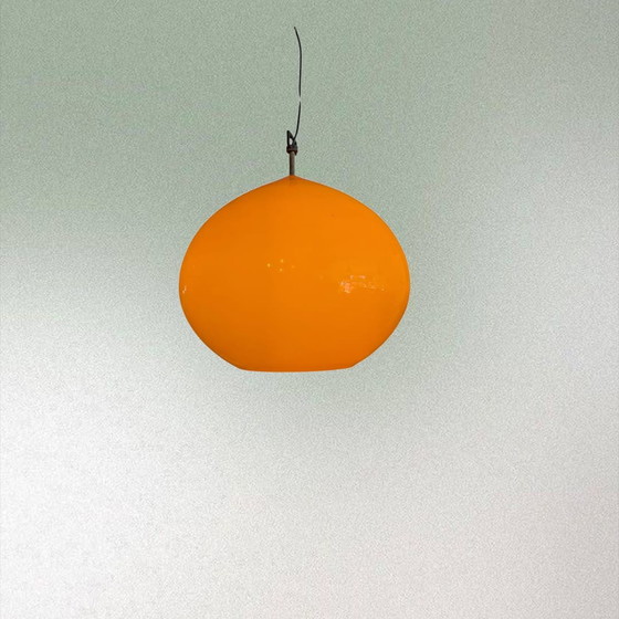 This beautiful vintage pendant lamp, model 'Onion', was designed by Alessandro Pianon for Vistosi in Italy. (Early 1960s) The orange "onion" shape is made of hand-blown Murano glass. The inside is made of opal white glass, which creates a lovely, wonderfully warm light. The lamp features a steel wire supporting the metal suspension bracket, as is customary with the larger model. Two different sizes and various colors were produced; this is the large version with a diameter of 45 cm in the beautiful Orange color. The lamp is in good condition with only light signs of use and 1 small chip (not very noticeable), see photo.