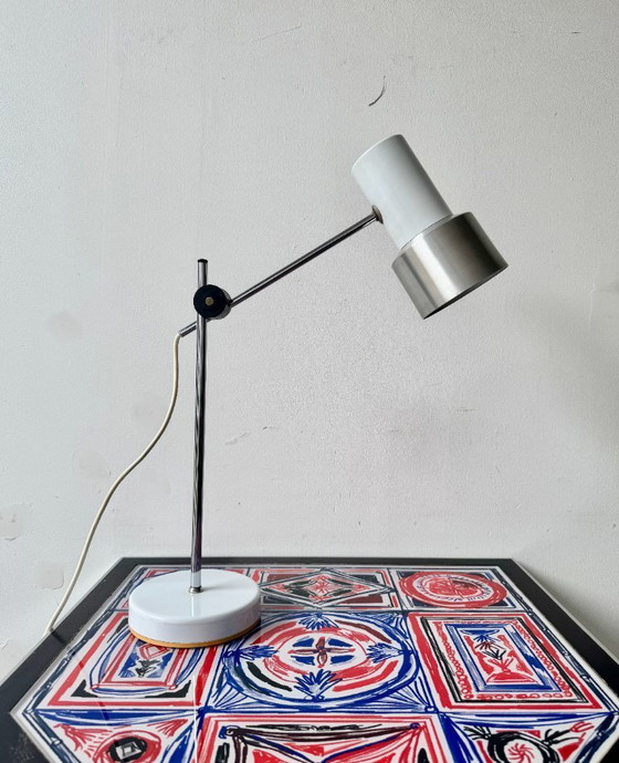 A stylish vintage Prova desk lamp, featuring a round metal shade, chrome arm and weighted circular base.
