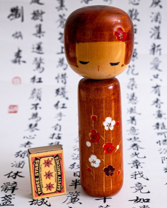 The original sticker reads Shinshū Matsumoto, referring to the Matsumoto area in Nagano Prefecture, a well-known center of kokeshi craftsmanship. The base bears the artist’s stamp. A refined collectible representing the sosaku kokeshi tradition, combining skilled craftsmanship with artistic expression. Ideal for collectors of Japanese folk art or as a timeless interior decor piece.