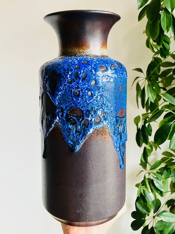This vintage Jasba vase is a real eye-catcher. It features the characteristic lava and drip glaze in deep blue, combined with warm brown and earth tones. Typical West German ceramics from the 1960s/1970s and beloved by fans of mid-century modern and Wabi-Sabi interiors.