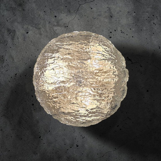 Beautiful vintage wall or ceiling lamp by Kaiser Leuchten, produced in Germany. This compact ceiling light features a heavy glass shade with a characteristic rough texture, often referred to as ice glass. The glass provides a beautiful diffused light and a subtle, sculptural appearance.