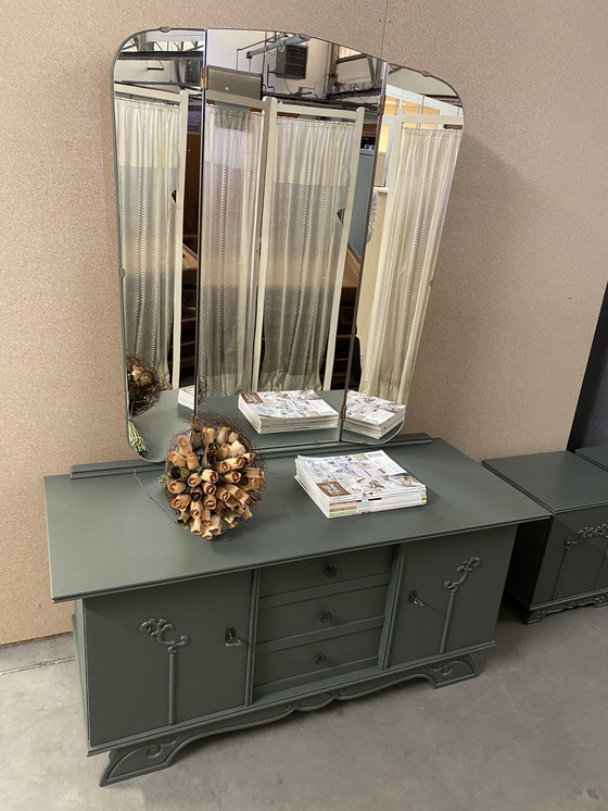Step back in time with this exquisite vintage dressing table, a perfect blend of elegance and functionality. The muted green finish adds a touch of sophistication, making it a charming addition to any bedroom or dressing area.